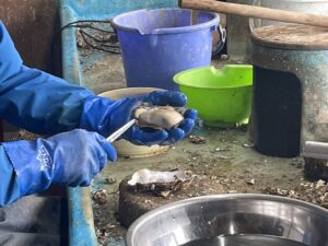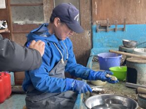 見学するだけではありません。実際に漁師さんの指導を受けながら、牡蠣むきにも挑戦できます。