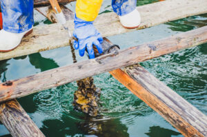 筏に到着すると、いよいよ牡蠣漁のスタート。