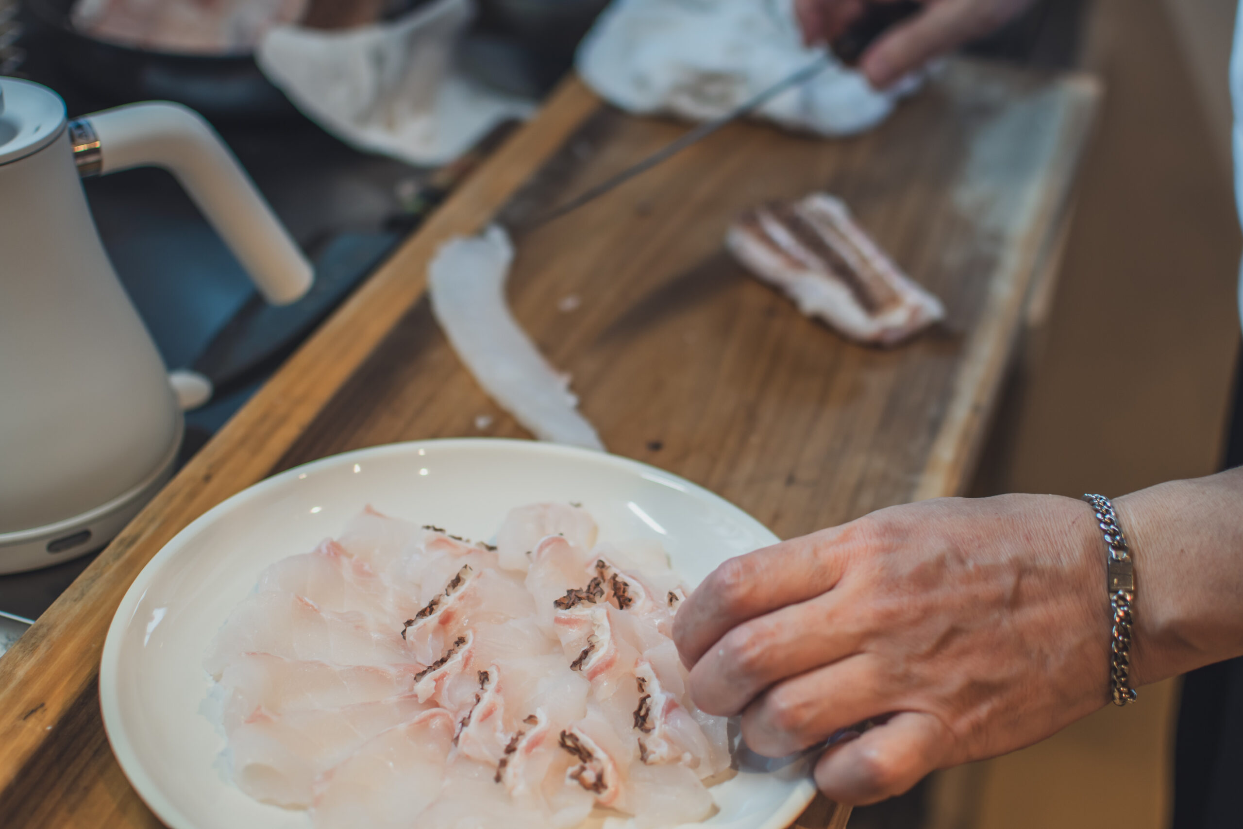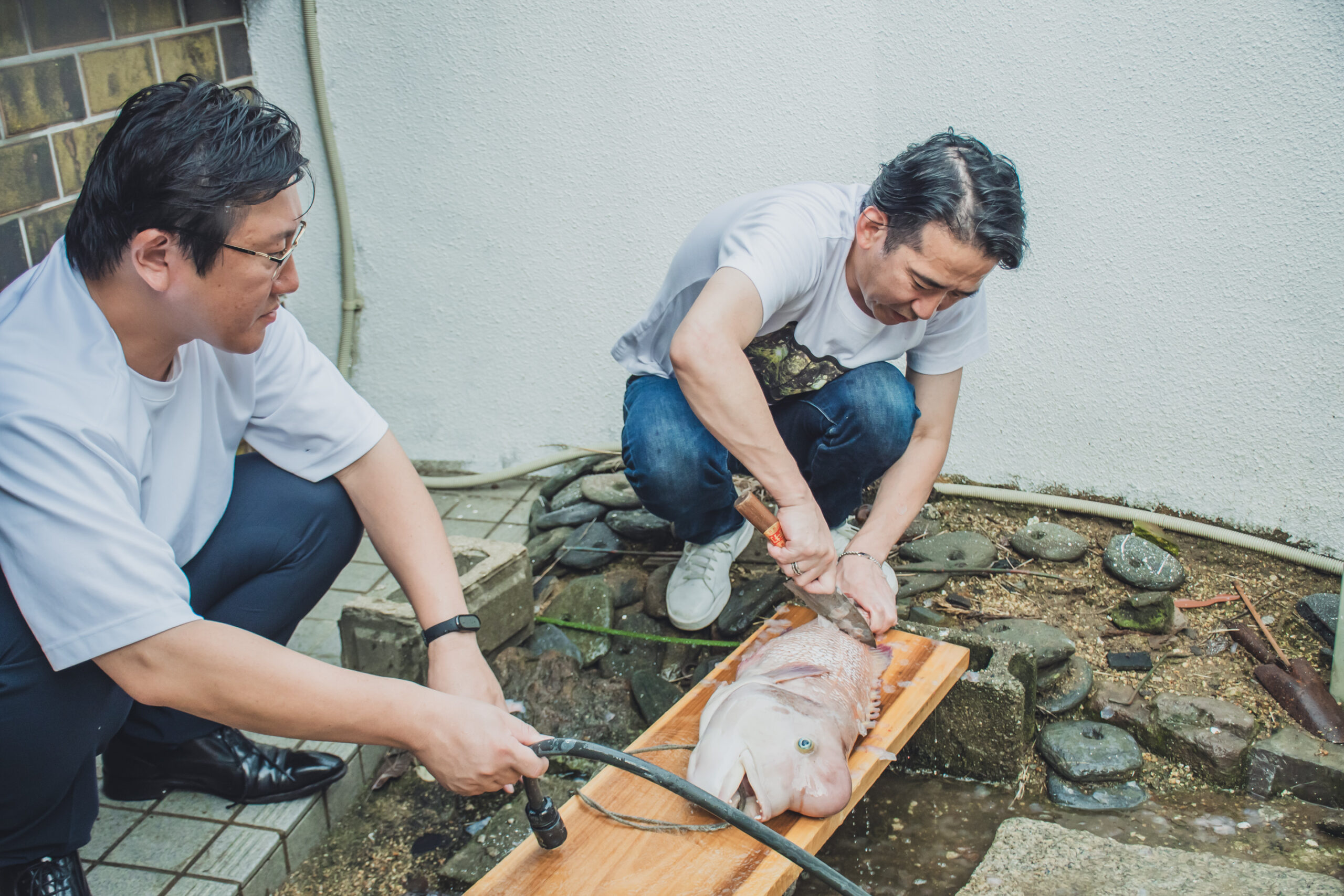 当日は、瀬居の漁師さんからいただいた新鮮なこぶだいを、福岡から参加された方がその場でお刺身や鯛めし、スープに調理してくださいました。